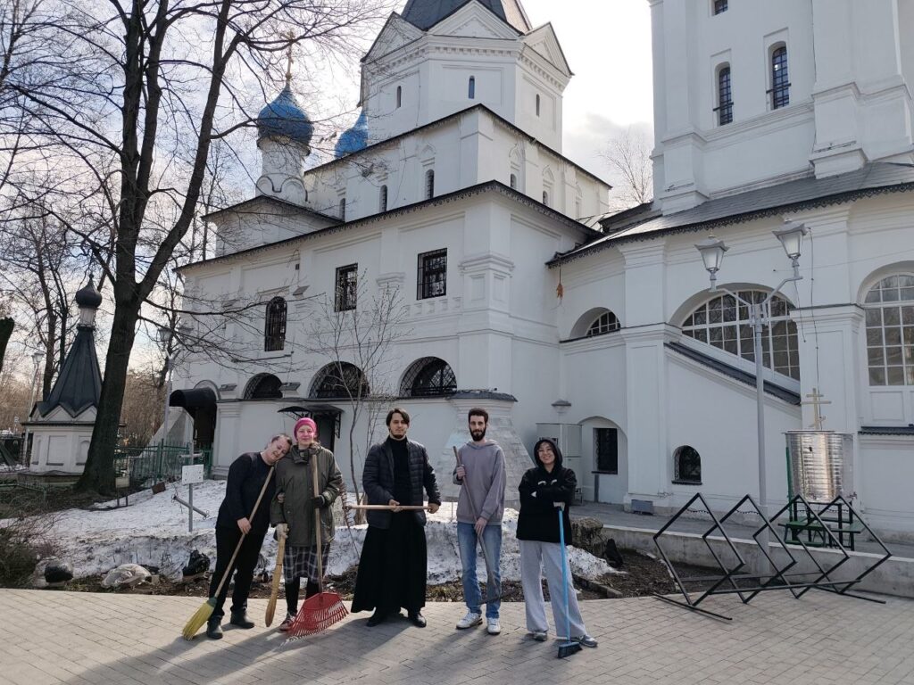 4 апреля 2026 года, в Лазареву субботу, слушатели воскресной школы для взрослых храма Успения Пресвятой Богородицы в Вешняках приняли участие в субботнике.Вместе с клириком храма диконом Владиславом Смирновым волонтеры убрали оставшийся снег, привели в порядок территорию кладбища, помыли окна в храме. После трудовых послушаний прихожане за дружеской беседой провели трапезу.