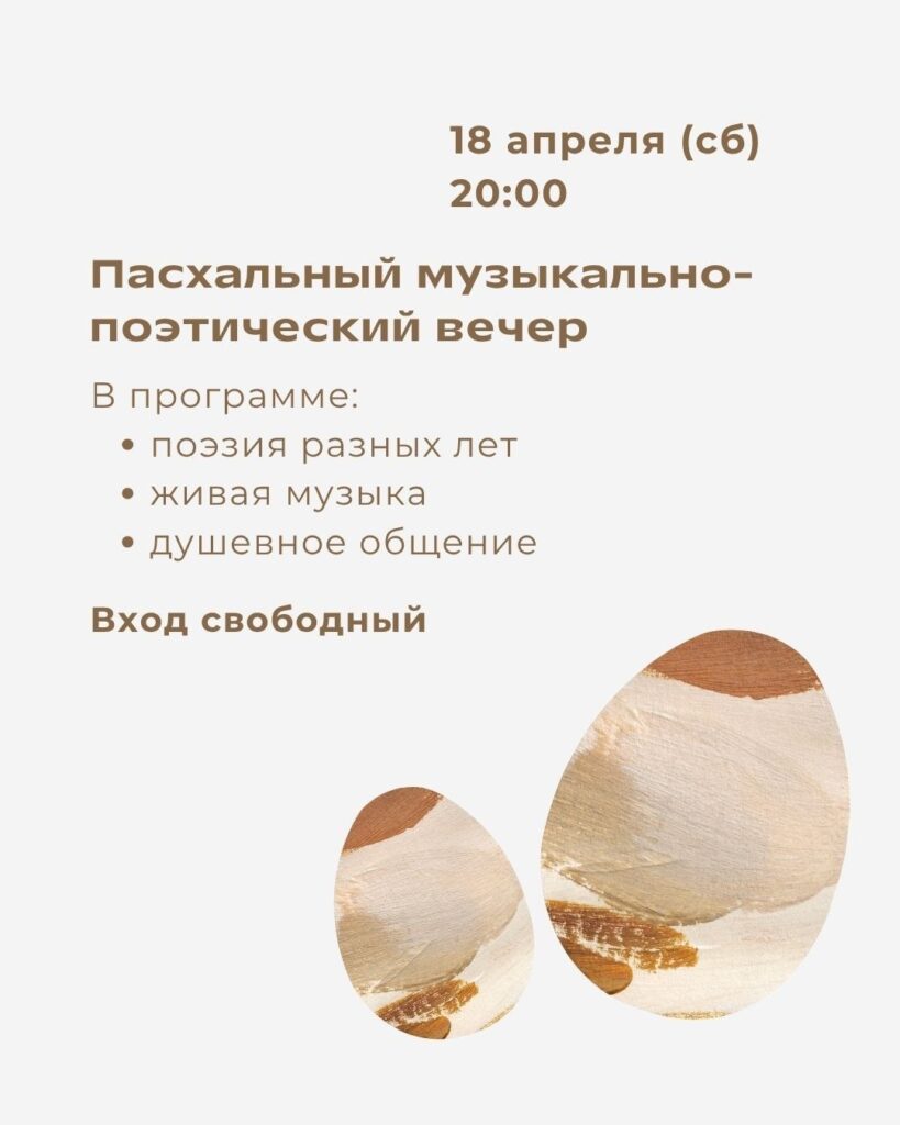 18 апреля 2026 года, в субботу Светлой седмицы, в 20:00, по окончании всенощного бдения, в храме иконы Божией Матери «Взыскание погибших» в Перове (Шоссе Энтузиастов, д. 44) пройдет Пасхальный музыкально-поэтический вечер, на который приглашаются все желающие.