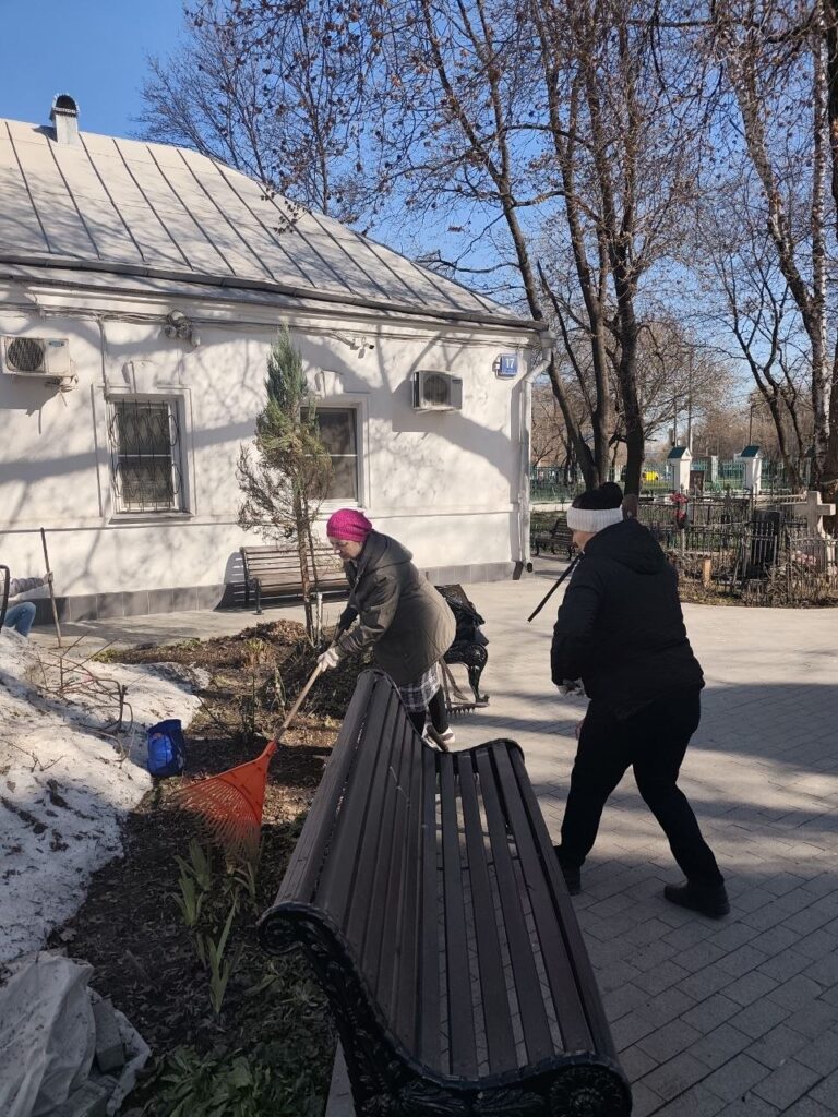 4 апреля 2026 года, в Лазареву субботу, слушатели воскресной школы для взрослых храма Успения Пресвятой Богородицы в Вешняках приняли участие в субботнике.